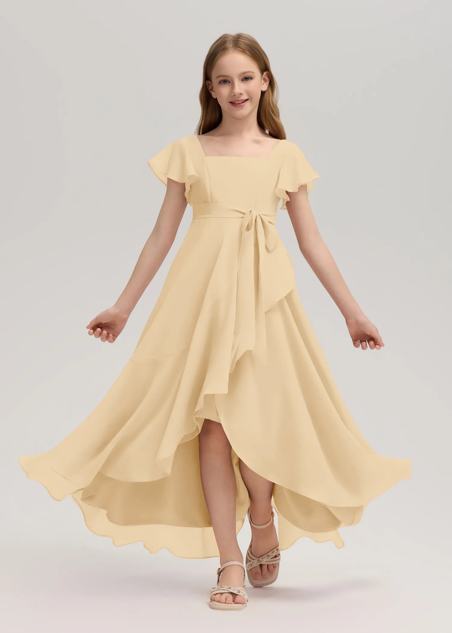 - 🌸ELEGANTES ASYMMETRISCHES CHIFFONKLEID:Dieses atemberaubende Kleid für Junior-Brautjungfern verfügt über einen eleganten asymmetrischen Saum, der vorne kürzer und hinten länger ist, was eine moderne und anmutige Silhouette schafft. Der fließende Chiffonstoff bewegt sich bei jedem Schritt wunderschön und ist perfekt zum Tanzen und für den Gang den Gang entlang. Das zeitgenössische Design kombiniert klassische Eleganz mit trendigen Stilelementen, die Ihre Kleine hervorheben werden.